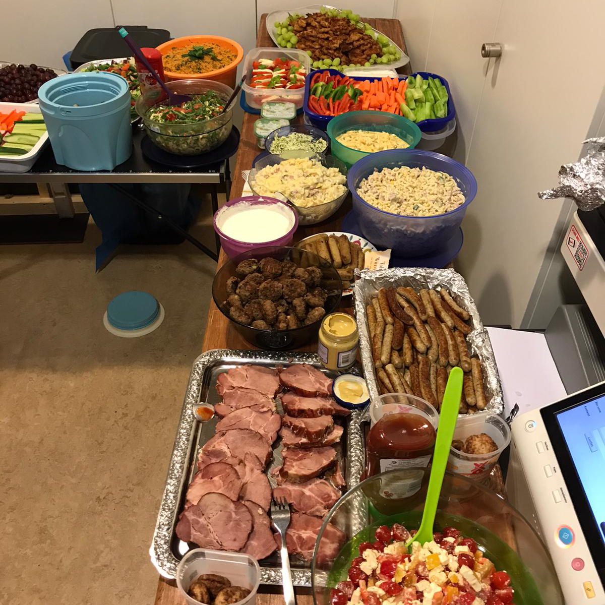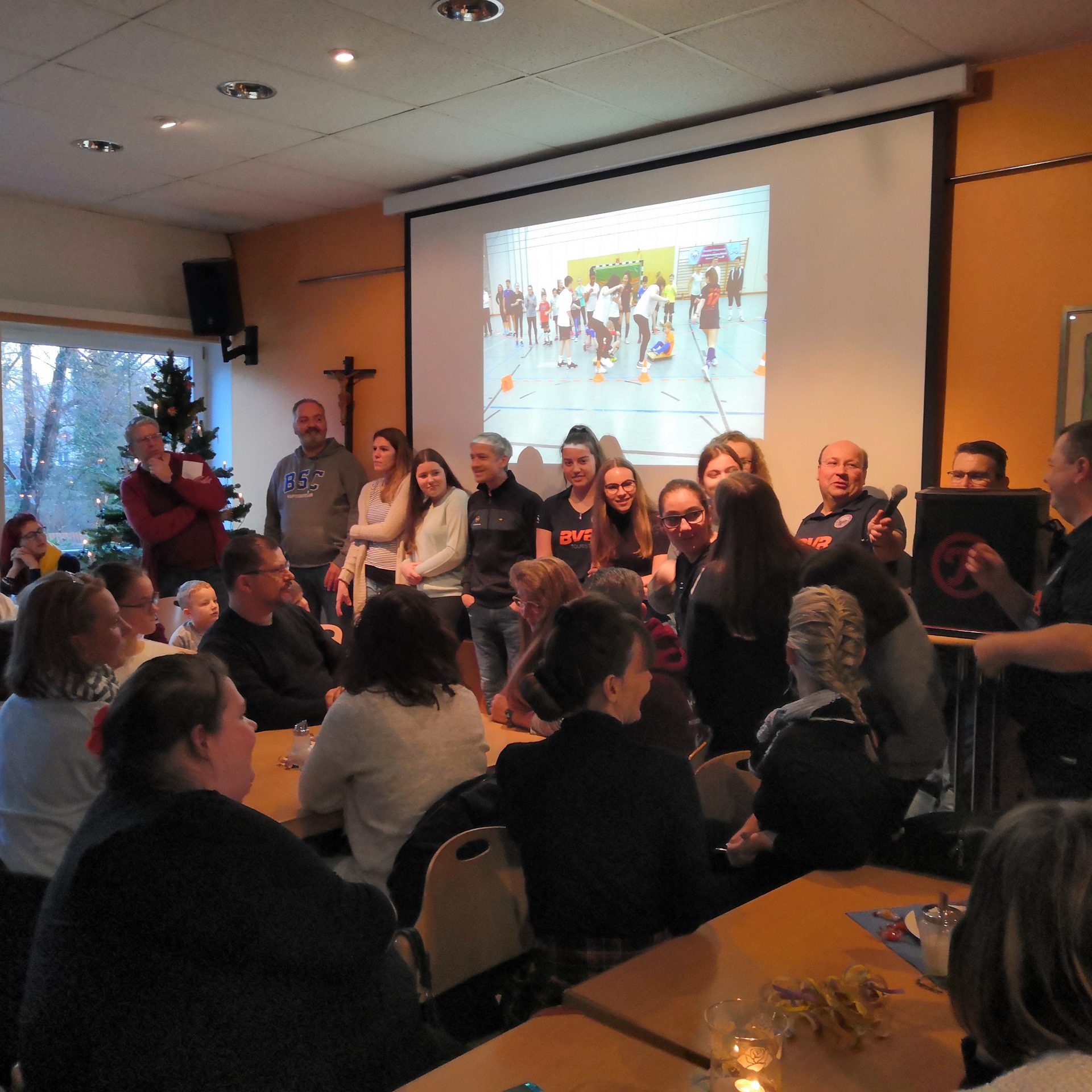 Das riesige Abendbuffet wurde dann auch freigegeben und geplündert. Lieben Dank an alle Mädels und Jungs (bzw. die Eltern) für die vielen leckeren Salate, Brote, Gemüsesticks, Käseplatten, Würstchen, Buletten, Schnitzel, und und und. An diesem Abend hat kein Gast die Veranstaltung hungrig verlassen. Und für alle Vereinskinder gab es noch eine tolle Überraschung zum Mitnehmen. Der Weihnachtsmann hatte für jedes Kind einen gefüllten HC BB Sportbeutel abgegeben, die jetzt verteilt werden konnten.