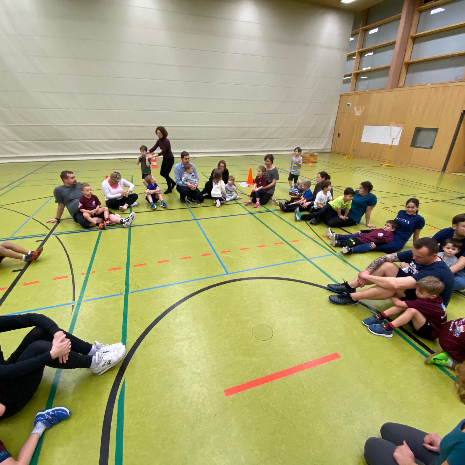 Wir starteten unser Training mit dem Schwungtuch. Hier durften die Kinder beim Maulwurfspiel ihre Eltern unter das Schwungtuch ziehen, schnell wurde es unter dem Schwungtuch zu voll. So folgte auch schon der erste Wettkampf: Eltern gegen Kinder. Beim Bälle einsammeln und nach Farben sortieren mussten die Kinder sich jedoch schnell geschlagen geben. Die Eltern gewannen mit Abstand.