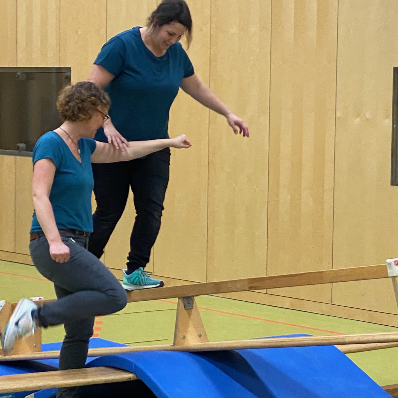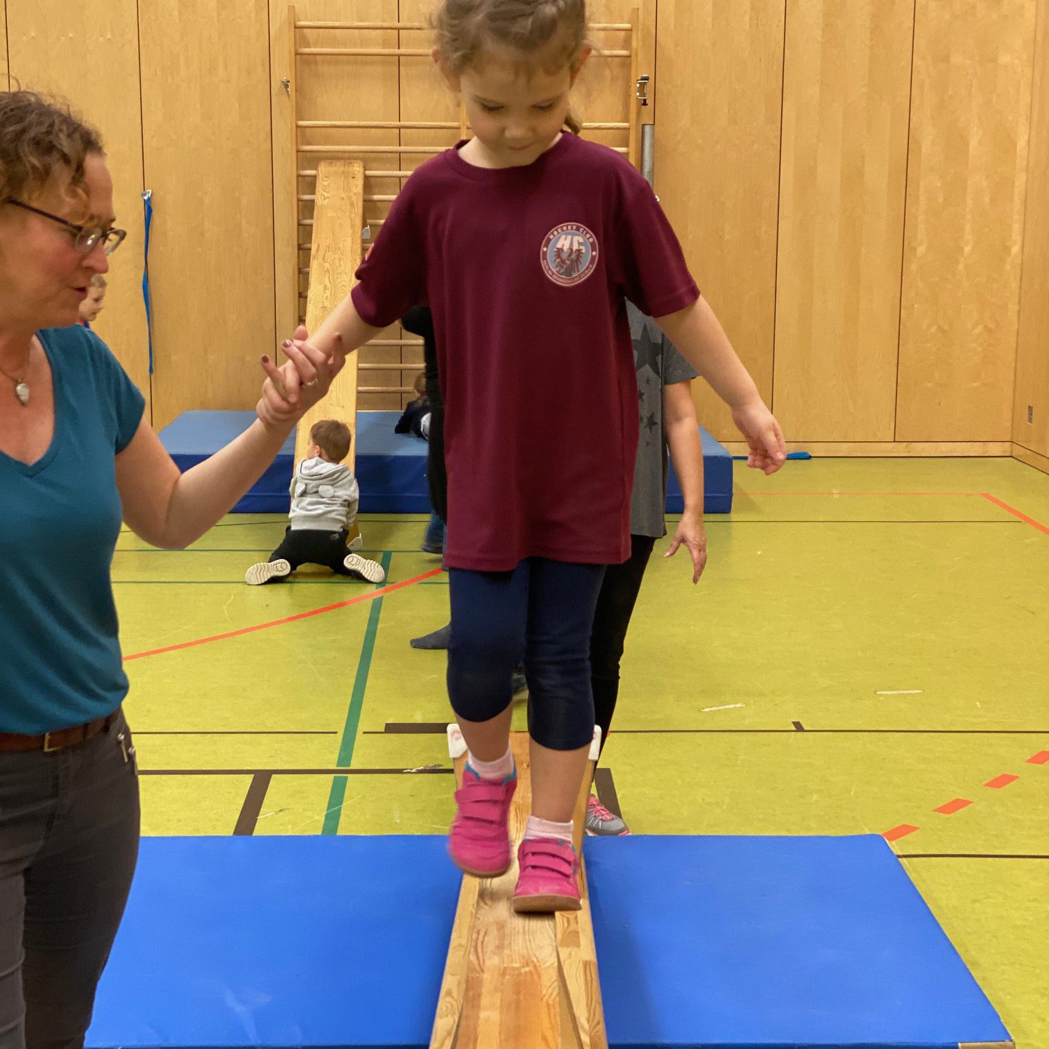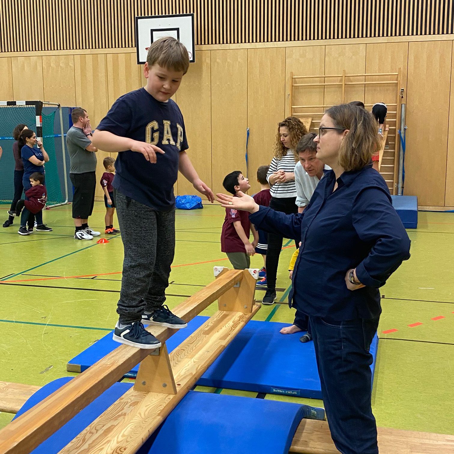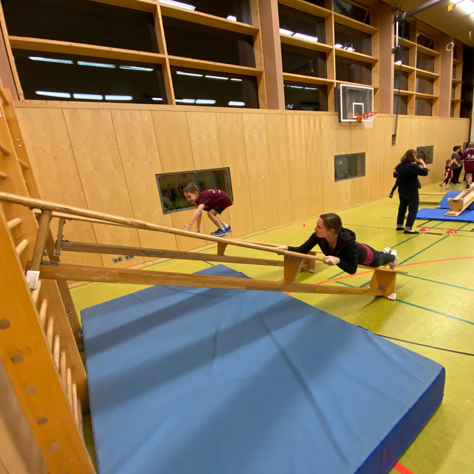 Das Highlight unseres Parcours war unsere große Wippe. Am Anfang waren die Kinder noch verhalten und freuten sich über eine stützende Hand. Zum Schluss beherrschte jedes Kind dieses Hindernis. Bei der Leichtigkeit der Kinder wollten sich dann auch einige Eltern probieren und starteten auf unserer Wippe.