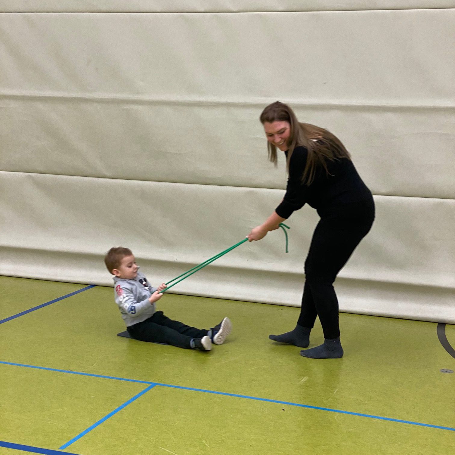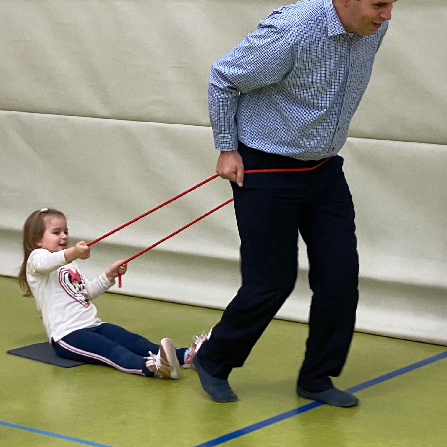 Beim „Schlittenfahren“ durften die Kinder mal kurz verschnaufen. Die Eltern zogen ihre Kinder quer durch die Halle und kamen so richtig ins Schwitzen. Jeder wendete hier seine eigene Technik an, es kamen ein paar sehr lustige und spannende Wettrennen zustande.
