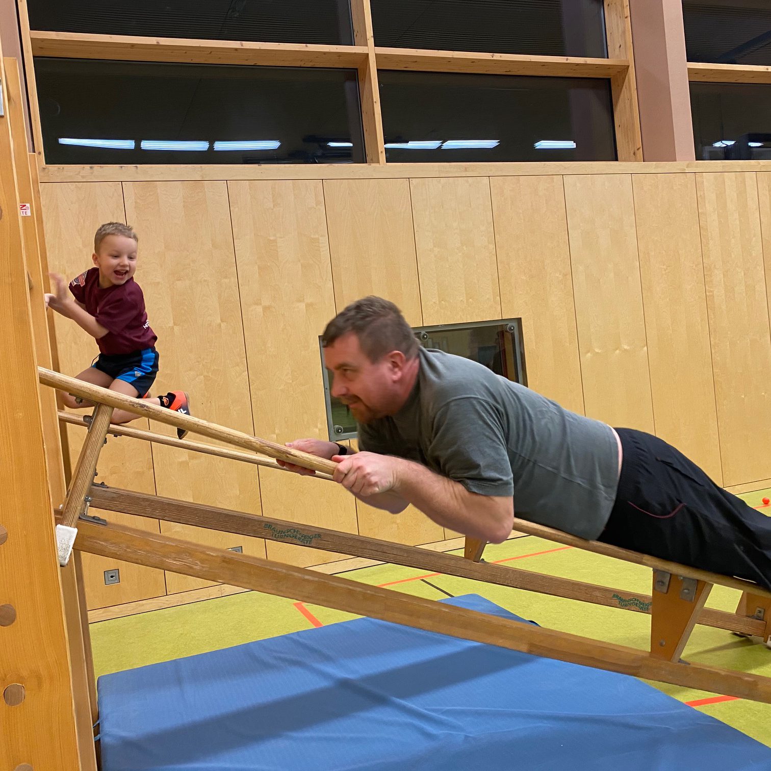 Beim „Bergsteigen“ durften die Kinder hochkrabbeln und die Eltern durften sich nur hochziehen. Nicht jedes Kind, konnte hier gewinnen. Manche Väter zeigten was in ihren Armen an Muskeln steckte.