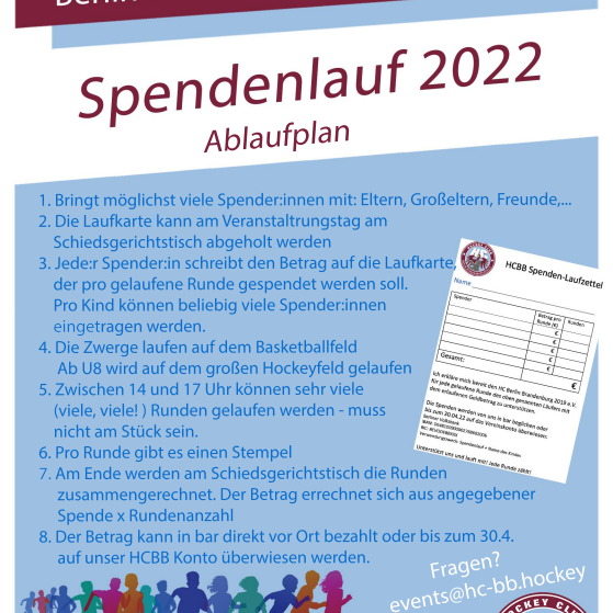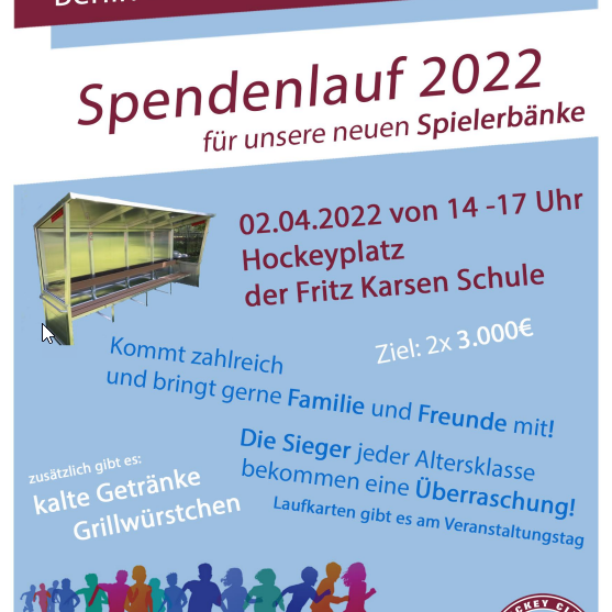Am 02.04.2022 (Samstag) findet von 14:00 Uhr bis 17:00 Uhr der Spendenlauf für unsere neuen Spielerbänke auf dem Hockeyplatz der Fritz Karsen Schule statt. Kommt zahlreich und bringt gerne Familie und Freunde mit!