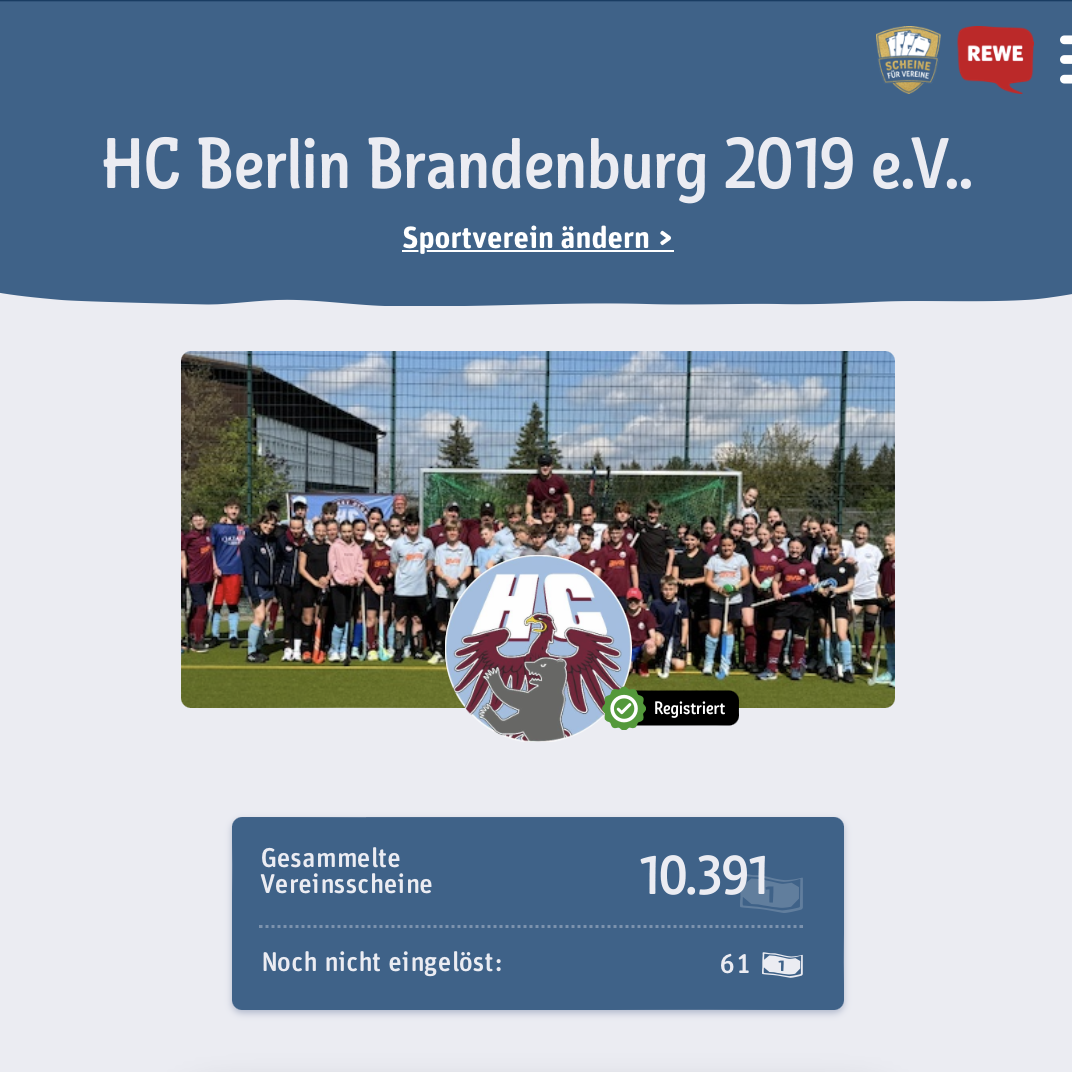wir sind überwältigt und voller Freude über eure unglaubliche Unterstützung! Dank eurer fleißigen Teilnahme an der REWE-Aktion „Scheine für Vereine“ haben wir es geschafft, beeindruckende 10.391 Vereinsscheine zu sammeln. Euer Engagement und eure Begeisterung sind einfach unbeschreiblich!