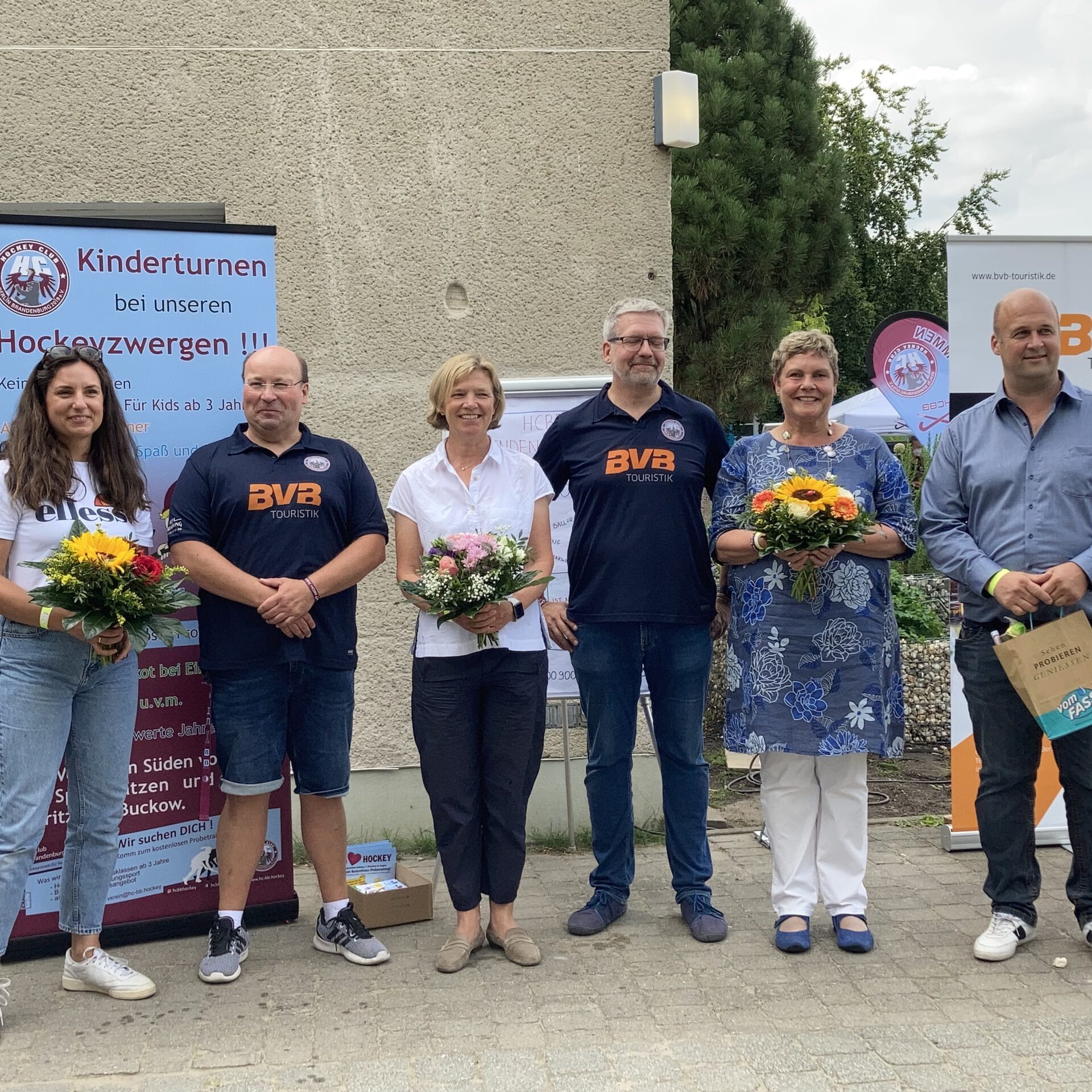 Aus Politik und Sport schauten ebenfalls zahlreiche, gern gesehene Gäste vorbei. Unter anderem haben uns Marie-Theres Gnauert (Präsidentin Berliner Hockey Verband e.V.), Karin Korte (Neuköllner Bezirksstadträtin für Sport, SPD), Nina Lerch (Kandidatin für den Wahlkreis 5 Britz/Buckow zu den Wahlen zum Abgeordnetenhaus, SPD) und Olaf Schenk (Mitglied Bezirksverordnetenversammlung Neukölln und Vorsitzender des Sportausschusses, CDU) besucht. Frau Korte konnte dabei in ihrer Rede verkünden, dass unser Verein ab sofort das vorrangige Nutzungsrecht für das Hockey Kunstrasenfeld der Fritz-Karsen-Schule gewährt wird und die Trainingszeiten ausgeweitet werden können. Die erfolgreiche Arbeit des HCBB wird dadurch gesichert und unterstützt.
